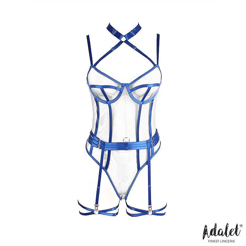Průsvitné síťované body v modré barvě s nastavitelnými ramínky, podvazky a kroužky na nohy. Zvýrazní křivky, podpoří sebevědomí a dodá outfitu smyslný, provokativní vzhled. Další informace