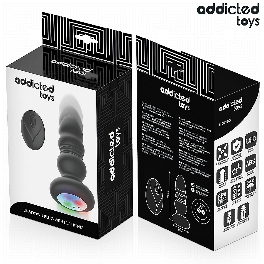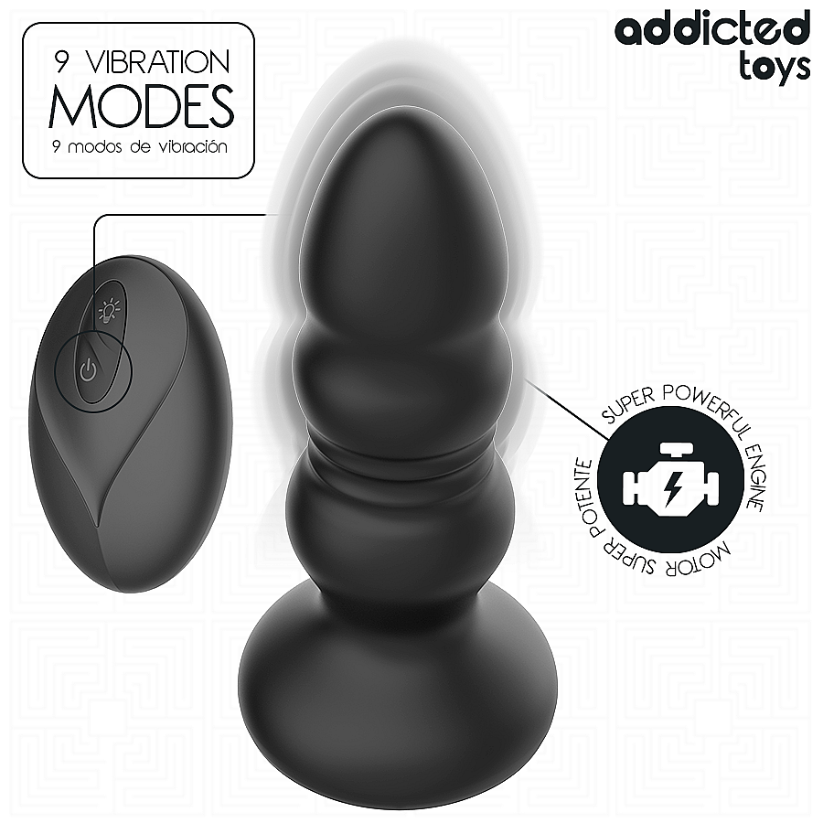 Addicted Toys Thrusting Vibrating Anal Plug od Addicted Toys potěší dvěma nezávislými motory, které rozvibrují i roztačí tělo do smyslných tahů. 9 režimů thrustingu střídá něžné pulzy i razantnější vlny. 9 vibračních módů proniká do hloubky a dá se libovolně kombinovat s tlačnými pohyby. Bezdrátové dálkové ovládání dovolí měnit rytmy jedním stiskem a předat kontrolu partnerovi, když si chcete pohrát na dálku. LED světlo měnící barvy v základně vytvoří svůdnou atmosféru a podtrhne moderní design. Prémiový silikon je sametově hebký a bezpečný pro tělo, zatímco široká základna zajišťuje jistotu a pohodlí při každém pohybu. Díky voděodolnému provedení si dopřejete více volnosti a bezstarostné čištění. Kompaktní rozměry 11,9 × 3,7 cm a 126 g hmotnosti zaručí příjemné zavádění a stabilní nošení. Nabíjení cca 70 minut přináší až 70 minut intenzivní rozkoše.