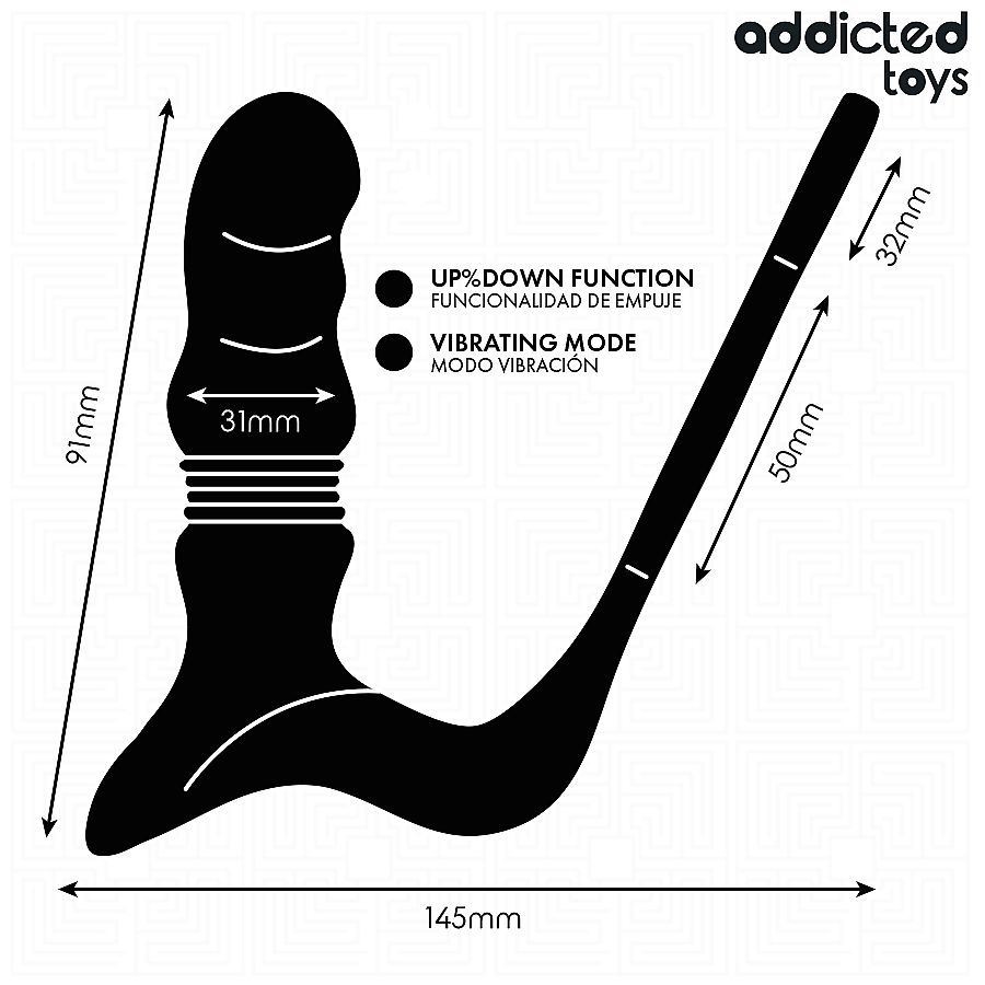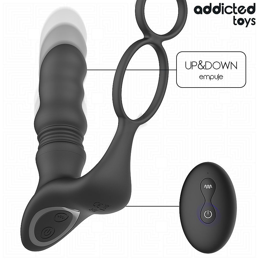 Up and Down Prostatic Ring od značky Addicted Toys spojuje trojici výkonných motorů s plynulými tlačícími pohyby a výraznými vibracemi pro mimořádně intenzivní stimulaci prostaty. Jeho zakřivený ergonomický tvar přesně kopíruje anatomii, aby zasáhl ta správná místa pohodlně a jistě. Devět funkcí tahových pohybů vás provede od jemných rytmických vln až po hlubší a důraznější přírazy, zatímco devět vibračních programů doladí každou chvíli podle vaší chuti. Široká stabilní základna drží vše bezpečně na místě a integrovaný dvojitý kroužek poskytuje jistý úchop a lepší kontrolu. Ovládání je intuitivní – buď přímo tlačítky na těle, nebo diskrétně pomocí bezdrátového dálkového ovladače. Tichý chod chrání vaše soukromí a neruší soustředění na potěšení. Prémiový silikon je sametově hebký, tělu bezpečný a snadno se čistí, takže si vychutnáte hladký klouzavý povrch i při delších hrátkách. Magnetické USB nabíjení je pohodlné; po 120 minutách nabíjení si užijete až 70 minut intenzivního provozu. Nenápadný a elegantní design z něj dělá diskrétního společníka pro každou příležitost.