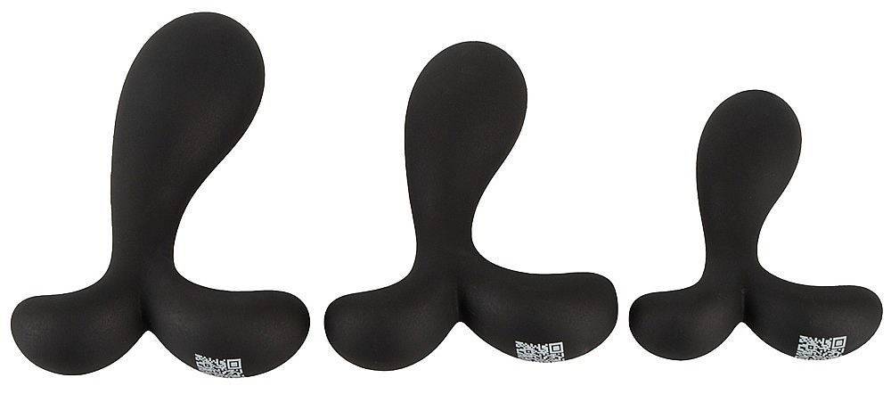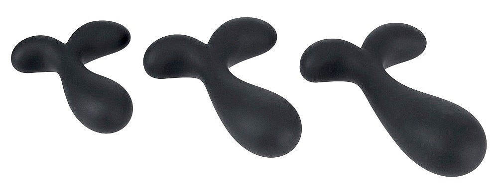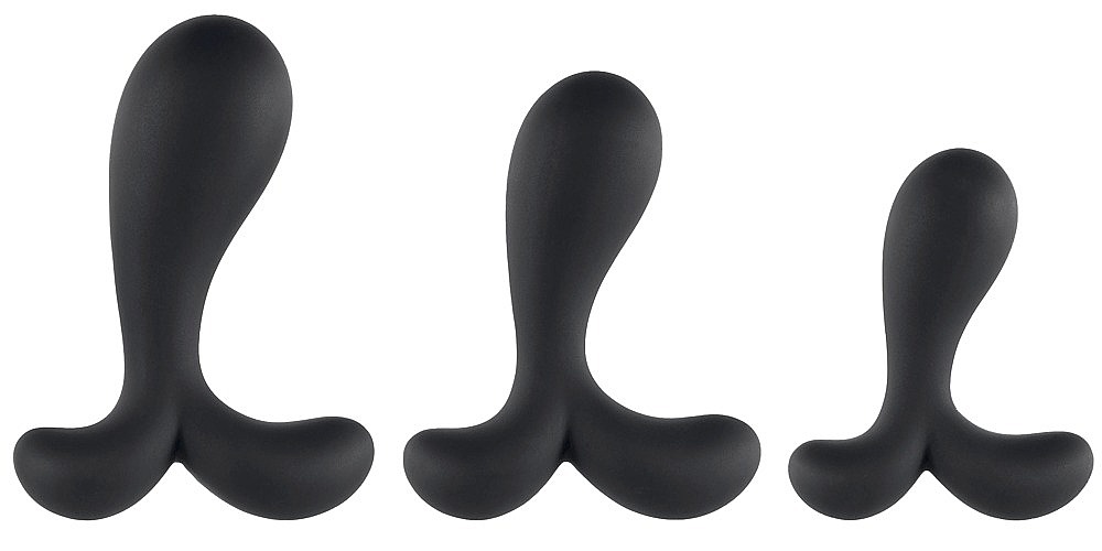Sada tří silikonových análních kolíků s mírně zahnutou špičkou pro masáž prostaty, dvouramenným stopperem a velikostmi S–L. Hladký, flexibilní design pro snadné zasunutí, pohodlí a trénink roztažení. Další informace