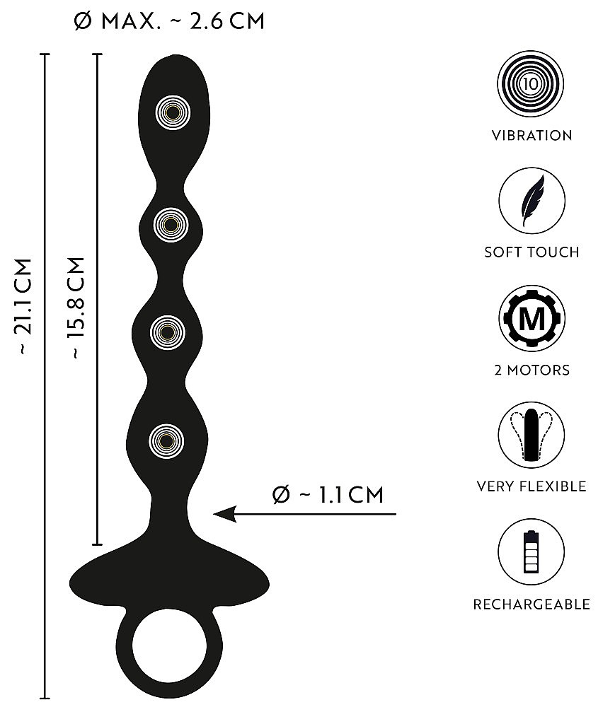 Ohebné anální kuličky se 4 drážkovanými vibrokuličkami, 2 motory a 10 režimy. Speciální skákající vibrace, hedvábně hladký silikon, kónický tvar, bezpečný stopper s kroužkem. Dobíjecí USB, délka 21,1 cm. Další informace