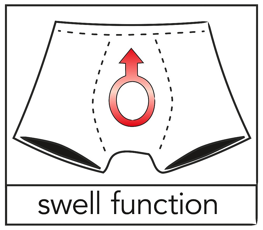Pánské trenýrky v černé barvě. Zajímavé provedení se speciální funkcí Swell. Díl pro penis je ušit tak, aby byl oddělen od těla speciální kapsičkou a tím vypadal v trenýrkách větší. Další informace