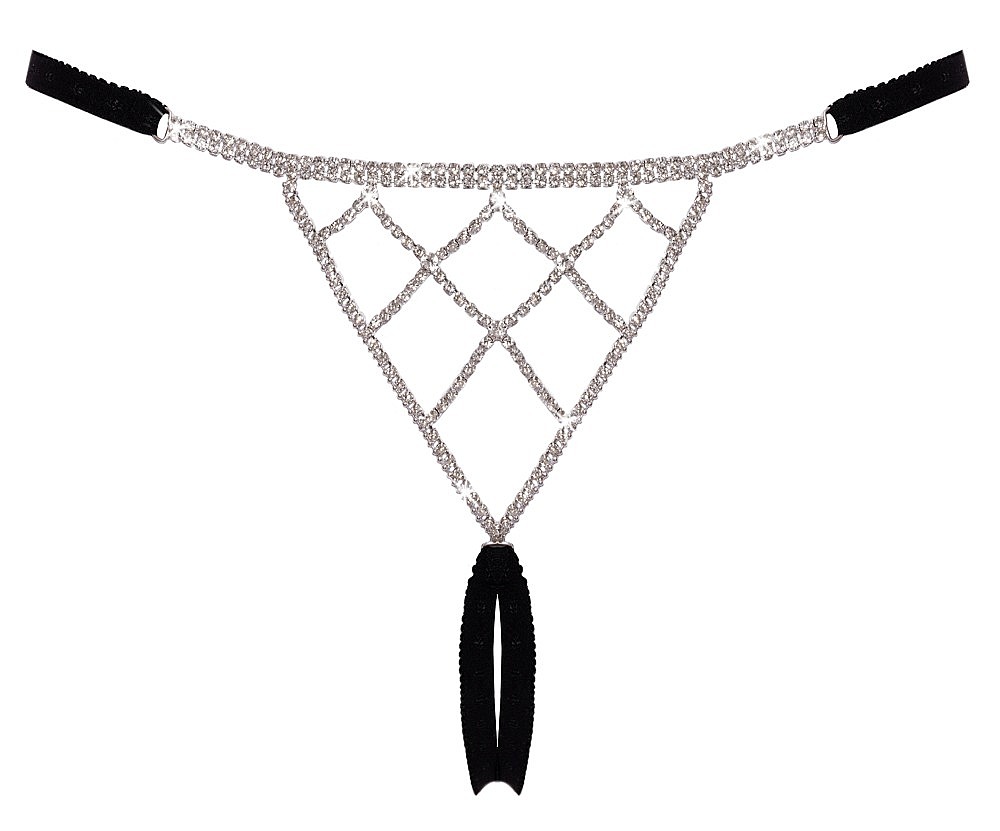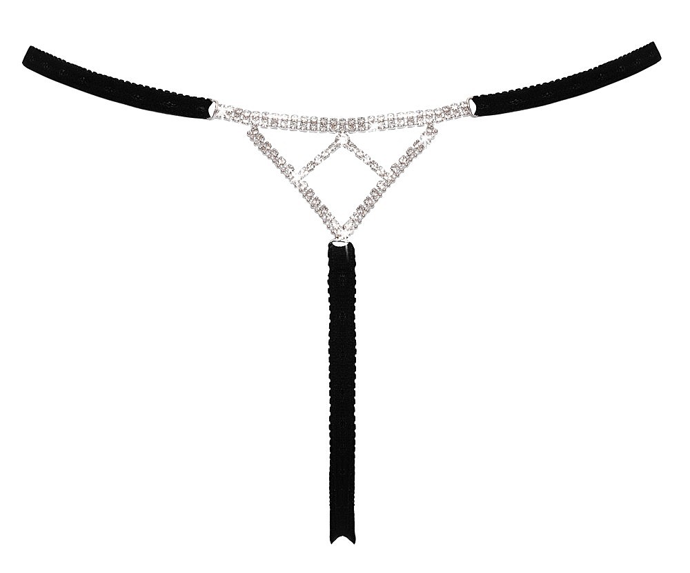Luxusní otevřená tanga s třpytivými kamínky, nastavitelným pasem a pružnými popruhy. Jemný materiál 90 % polyamid, 10 % elastan. Univerzální velikost S–L, černá se stříbrnými detaily. Další informace