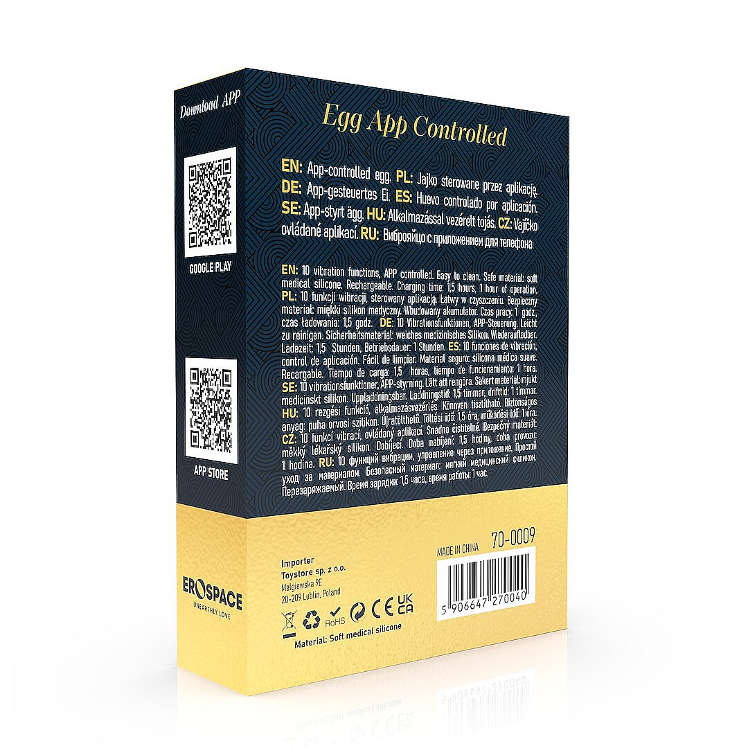 Erospace Sweet Play A9 App-controlled Egg od značky Erospace je sofistikovaná erotická pomůcka pro intenzivní a variabilní stimulaci. Nabízí ovládání přes aplikaci i tlačítky přímo na pomůcce, takže si můžete užít diskrétní hru o samotě i odvážnější experimenty ve dvojici. Díky 10 vibračním funkcím snadno střídá jemné chvění i výraznější pulzaci a přizpůsobí se náladě i citlivosti těla. Povrch z hebkého lékařského silikonu je příjemný na dotek, šetrný k pokožce, hypoalergenní a navržený pro pohodlné používání bez podráždění. Voděodolné provedení IPX6 rozšiřuje možnosti použití i do sprchy nebo vany, kde se hra stává ještě smyslnější. Tichý motor pomáhá zachovat soukromí, zatímco vestavěná dobíjecí baterie s USB nabíjením zajišťuje pohodlný provoz bez starostí s výměnou baterií. Po plném nabití nabídne přibližně 1 hodinu používání a nabije se zhruba za 1,5 hodiny. Snadná údržba navíc dělá z této pomůcky praktického a svůdného společníka pro pravidelné potěšení.