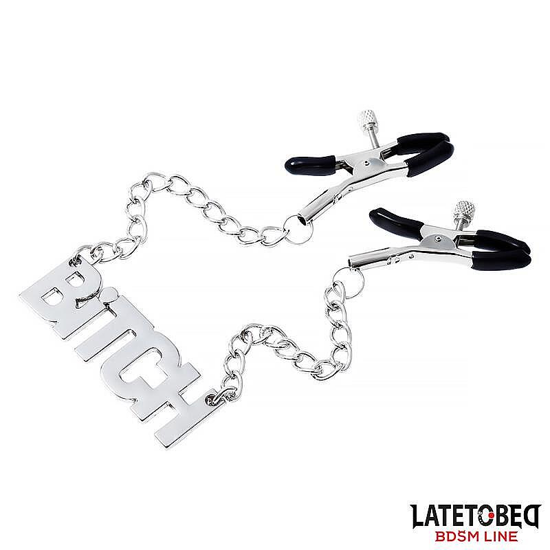 LATETOBED BDSM LINE Nipple clamps with Chain BITCH od značky LATETOBED BDSM LINE jsou klasické svorky na bradavky s řetízkem, které potěší milovníky intenzivních a temnějších hrátek. Díky nastavitelnému provedení si snadno upravíte tlak přesně podle své chuti a zkušeností, takže si můžete užít jemné škádlení i výraznější stimulaci. Ochranné krytky pomáhají chránit citlivou pokožku před poškozením a zvyšují komfort při nošení. Spojovací řetízek dodává celé hře vizuální i praktický rozměr, podporuje pocit kontroly a umocňuje erotické napětí při párových BDSM scénářích.