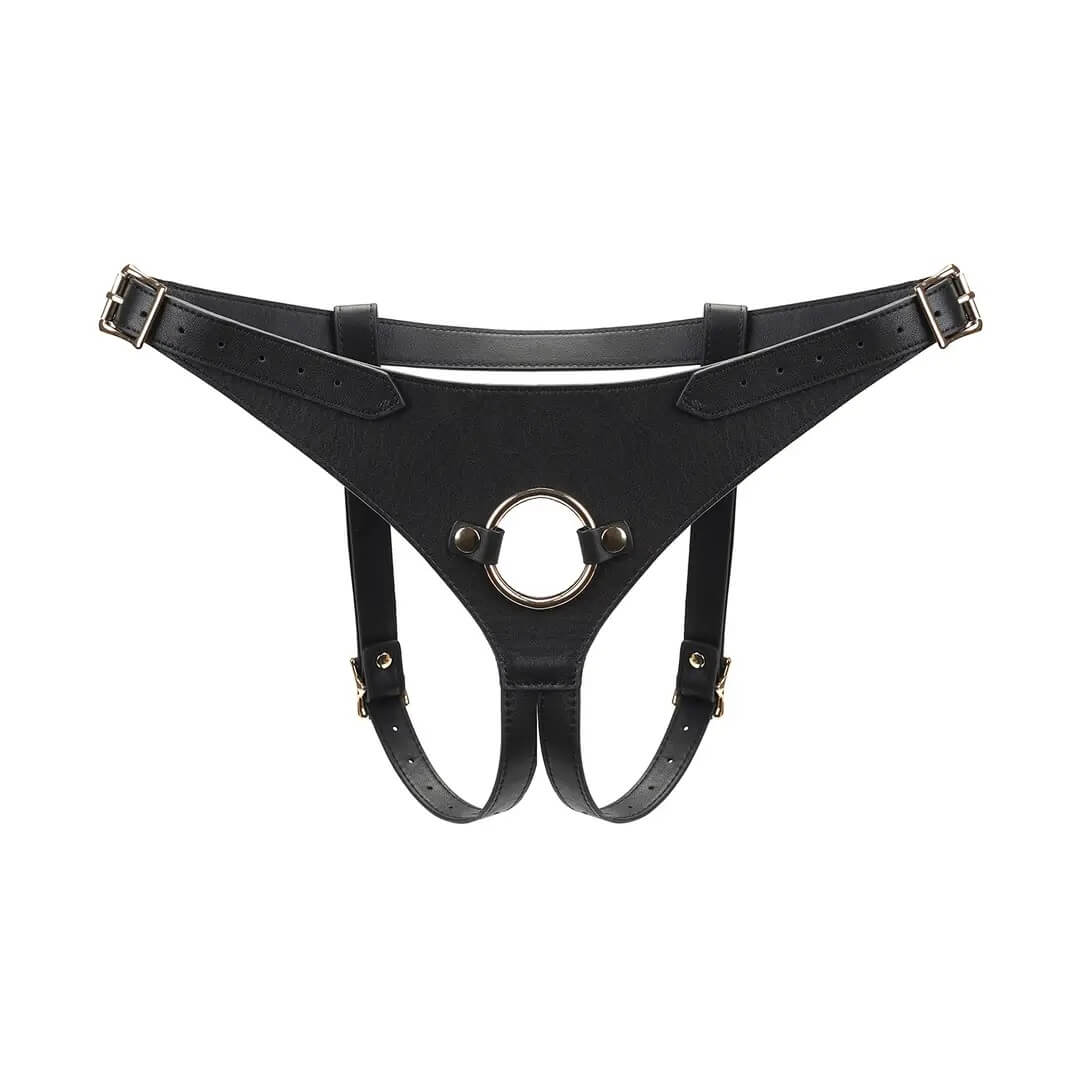 Luxusní kožený strap-on postroj z hovězí kůže se zlatým kováním. Přední O-kroužek 3,8 cm, nastavitelný obvod pasu 74,9–111,8 cm. Styl, jistota a pohodlí pro vaše Dark Secret fantazie. Další informace