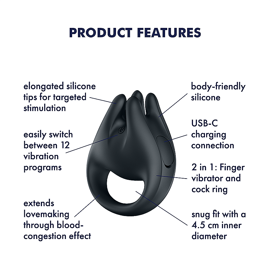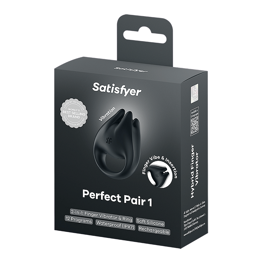 Satisfyer Perfect Pair 1 od značky Satisfyer je chytrá 2v1 erotická pomůcka navržená pro genderově neutrální potěšení. Můžeš jej nosit jako vibrační návlek na prsty i jako erekční kroužek, takže se snadno přizpůsobí sólovým hrátkám i párovému objevování. Čtyři delší silikonové výstupky příjemně hladí klitoris i další erotogenní zóny a pomáhají směrovat intenzivní, hluboké vibrace přesně tam, kde je chceš cítit nejvíc. Díky 12 vibračním programům si můžeš dopřát něžné rozechvění i výraznější pulzy, a to pohodlně pomocí tlačítka přímo na hračce. Jako kroužek se díky pružnému provedení dobře přizpůsobí penisu a přenáší stimulaci také na varlata nebo partnerčiny citlivé body během společné hry. Super měkký silikon je šetrný k tělu, příjemný na dotek a zároveň skvěle vede vibrace, takže každý dotek působí ještě svůdněji. Kompaktní rozměry z něj dělají skvělou cestovní pomůcku, kterou si oblíbí začátečníci i zkušení milovníci vzrušení. Nechybí ani tichý režim pro diskrétnější použití.