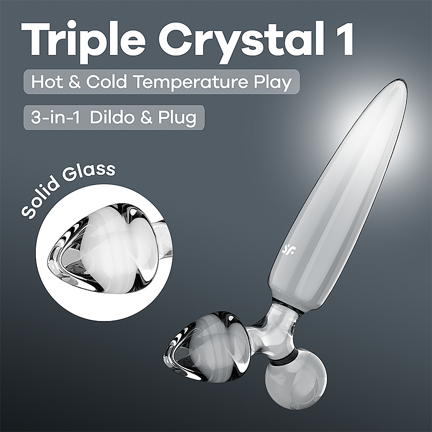 Satisfyer Triple Crystal 1 (Transparent) je smyslný skleněný dildo s trojitou porcí rozkoše. Jeho 21cm zúžené tělo se s ladností ponoří tam, kde ho chcete cítit, zatímco dvě menší rozdílné zásuvné hlavice lákají ke střídání rytmů i intenzit. Hladký povrch klouže po kůži jako hedvábí a s kapkou lubrikantu se promění v plynulý tanec na vašich křivkách. Temperaturně odolné borosilikátové sklo dovolí horkou i studenou hru – předehřejte ve vodě nebo ochlaďte v lednici a nechte nervová zakončení jiskřit. Široká základna drží vše bezpečně na místě a dělá z hračky ideální volbu i pro anální potěšení. Unisex design zve ke hrám o samotě i ve dvou, na klitoris, vaginu i análek, a klidně i k celotělovým masážím, kdy kuličkový chlad či hřejivost rozpohybují fantazii. Sklo je odolné vůči roztříštění, dále je lehké, hygienické a snadno se čistí. Satisfyer Triple Crystal 1 (Transparent) je prostě křišťálová entrée do světa precizní stimulace, která hýčká každý milimetr vašeho těla.