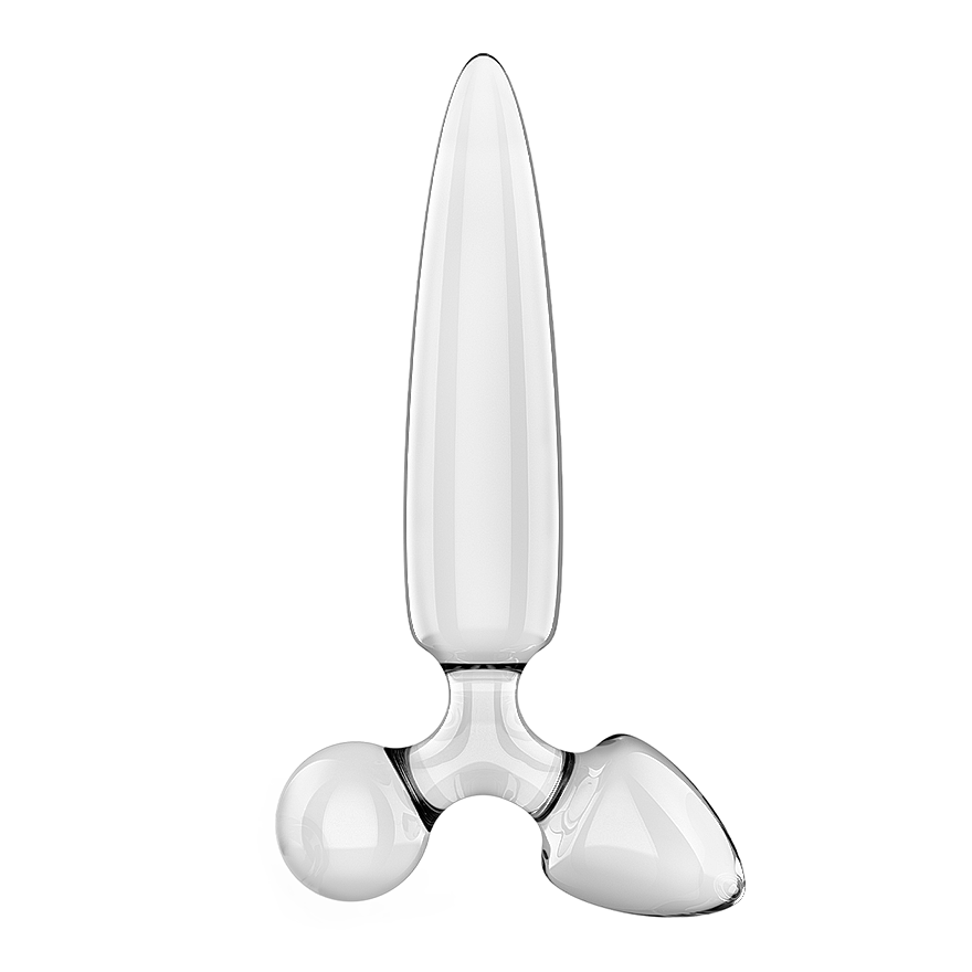 Skleněný dildo s třemi různými konci z borosilikátového skla. Vhodné pro teplé i studené hrátky, unisex, bezpečná široká základna, hladký povrch, snadná údržba. 21 cm délka hlavního dilda, 15letá záruka. Další informace