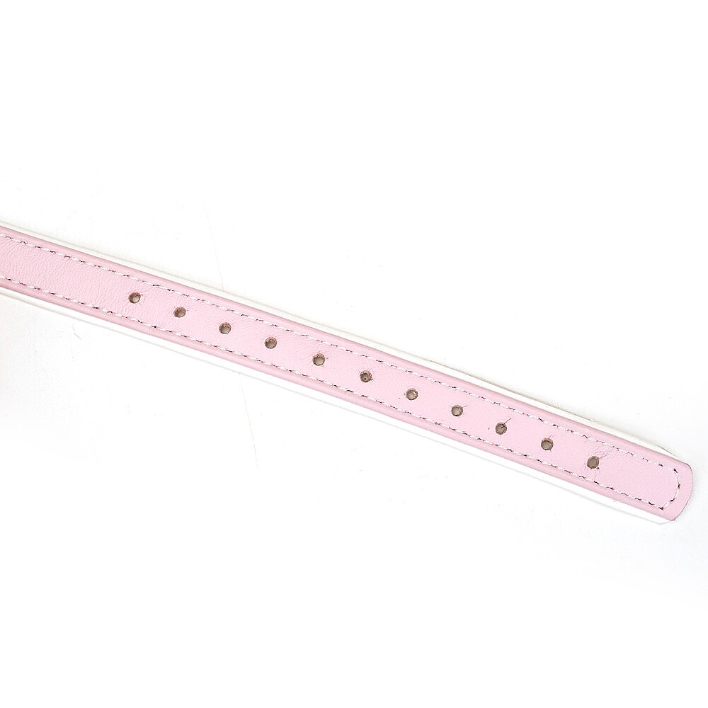 White & Pink Fairy Goat Leather Ball Gag si tě získá jemnou bílou a buble-gum růžovou kozí kůží, která působí ženským a luxusním dojmem. Silikonová kulička v pastelově růžové barvě má tři dýchací otvory pro bezpečnější a pohodlnější hru – vzrušení proudí, dech zůstává. Růžově zlaté kování dodává glamour a promění každé připnutí v malý rituál. Robustní kovové přezky se postarají o jistotu a díky nastavení 44,5–57,5 cm snadno najdeš perfektní fit. Ozdobné nýty přidávají špetku opulence, zatímco hebká, avšak pevná kulička drží poslušnost přesně tam, kde ji chceš.